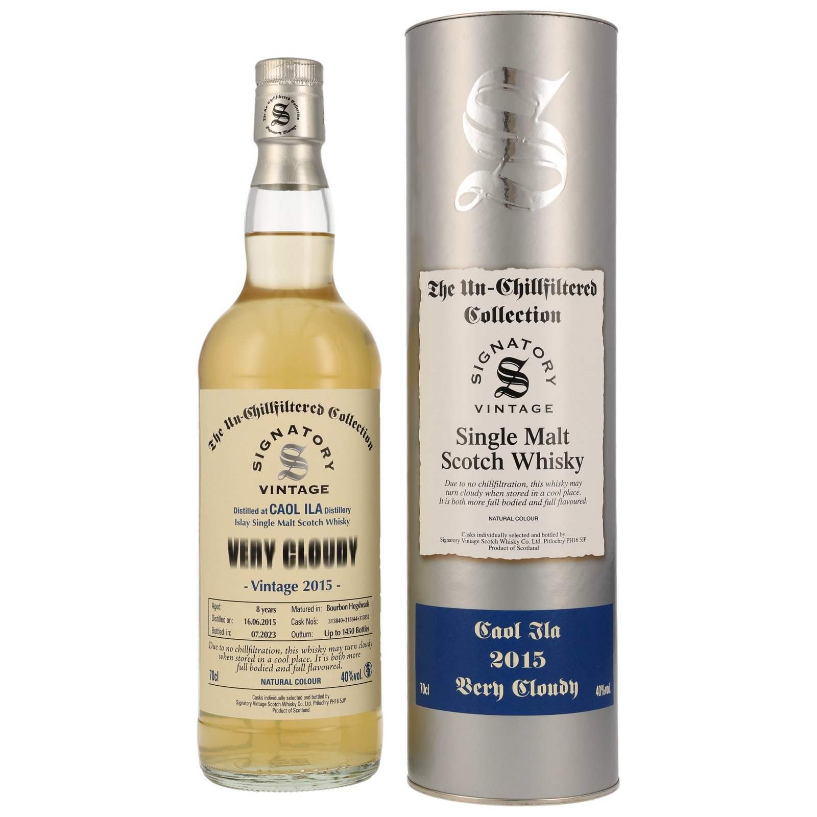 Dieser, vom unabhängigen Abfüller Signatory Vintage in seiner Un-Chillfiltered Collection, als Very Cloudy, abgefüllte Single Malt Whisky kommt aus der Caol Ila Brennerei. Die Whiskys der Very Cloudy Serie sind nicht kühlgefiltert und haben zugleich einen niedrigen Alkholgehalt, was zu einer Eintrübung des Whisky führen kann. Für diesen Single Malt wurden drei verschiedene Fässer mit den Nummern 313840, 313844 und 313852 vermählt. Alle wurden 2015 destilliert und durften 8 Jahre lang reifen. Abgefüllt wurde er 2023 mit Trinkstärke von 40,0% vol., natürlich ungefiltert und ungefärbt. Dabei ist er limitiert auf 1450 Flaschen.