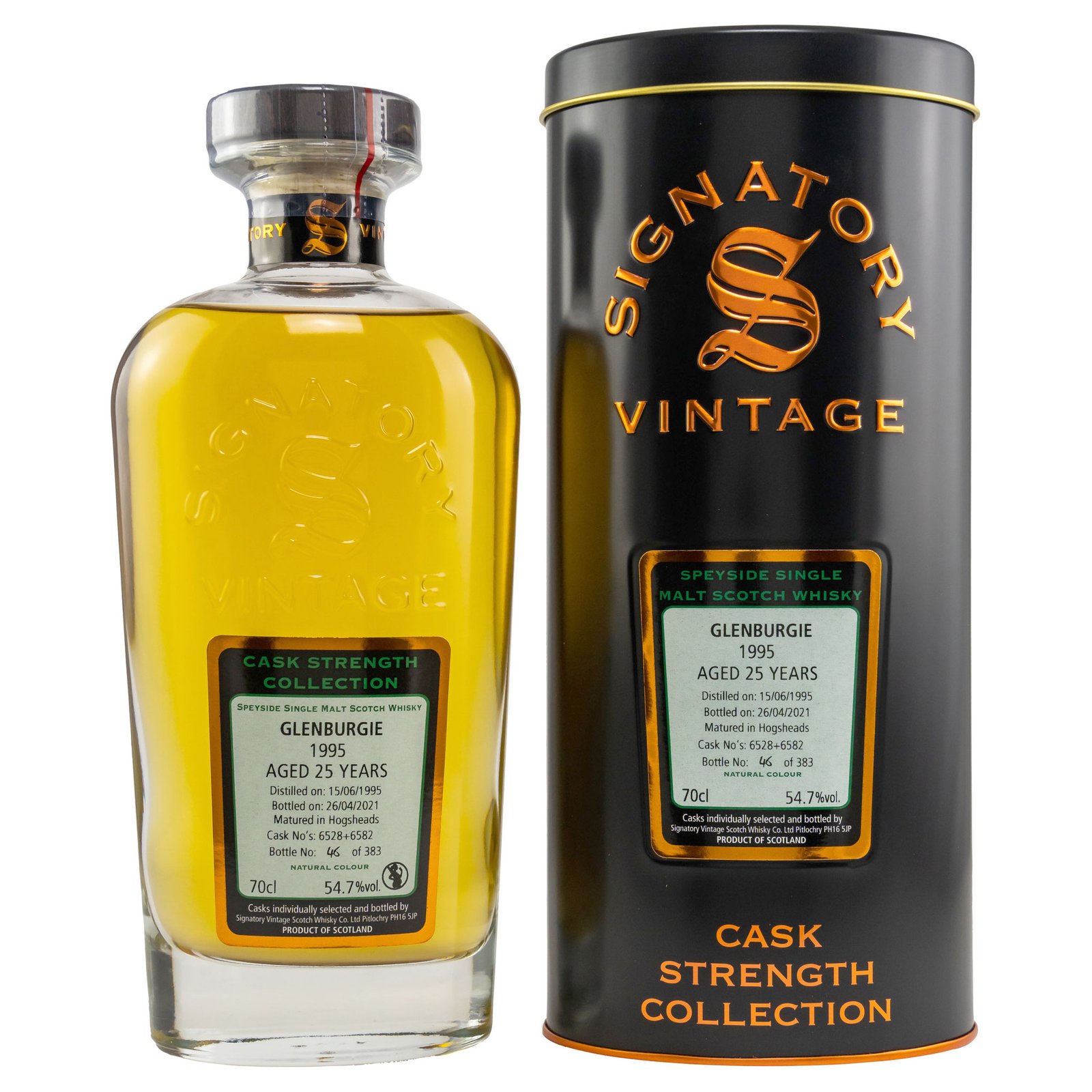 Der Glenburgie 1995/2021 – 25 Jahre Single Malt Whisky stammt aus den Hogshead Fässern No. 6528+6582. Als Whisky der Cask Strength Collection des unabhängigen Abfüllers Signatory, durfte er ein viertel Jahrhundert reifen, bevor er in den schönen Dekanter gefüllt wurde. Die genaue Vorbefüllung ist unbekannt, es ist jedoch sehr wahrscheinlich, dass es sich um ein Fass aus amerikanischer Weißeiche handelt. Die Dauben waren zuvor vermutlich in der Bourbonproduktion im Einsatz. Da es sich um ein Single Cask handelt, ist er natürlich streng limitiert. Es wurden nur 383 Flaschen abgefüllt. Bestellen Sie gleich IHRE Flasche!