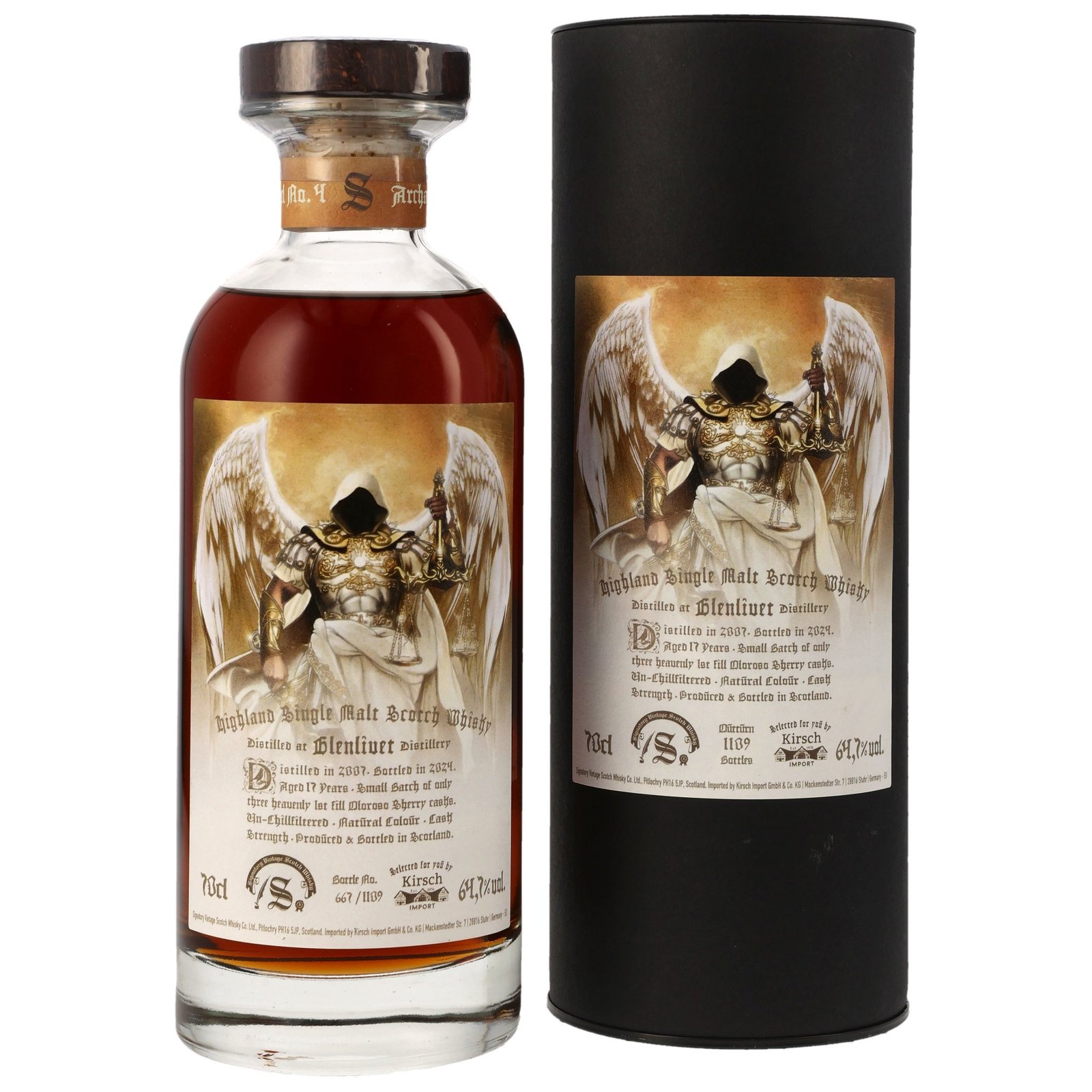 Die Grundzutaten dieses Single Malt Whiskys sind natürlich Gerstenmalz und Wasser. Ganz ohne Rauch schmiegt sich dieser Whisky an Ihren Gaumen. Die 64.7% Vol. schenken dem Single Malt Whisky seine Kraft. Dunkle Rosinen und feine Gewürze bekommt er aus dem Sherryfass. Und er bekannt “ganz natürlich” Farbe – denn hier wurde nicht nachgeholfen. Der satte Farbton kam ganz natürlich über die Fassreifung zustande. Destilliert wurde der Archangel No.4 im Jahr 2007; abgefüllt 2024! Die Reifezeit betrug von daher ganze 17 Jahre. Das hohe Alter zeigt sich im komplexen Geschmack und in den vielseitigen Aromen dieses Whiskys.