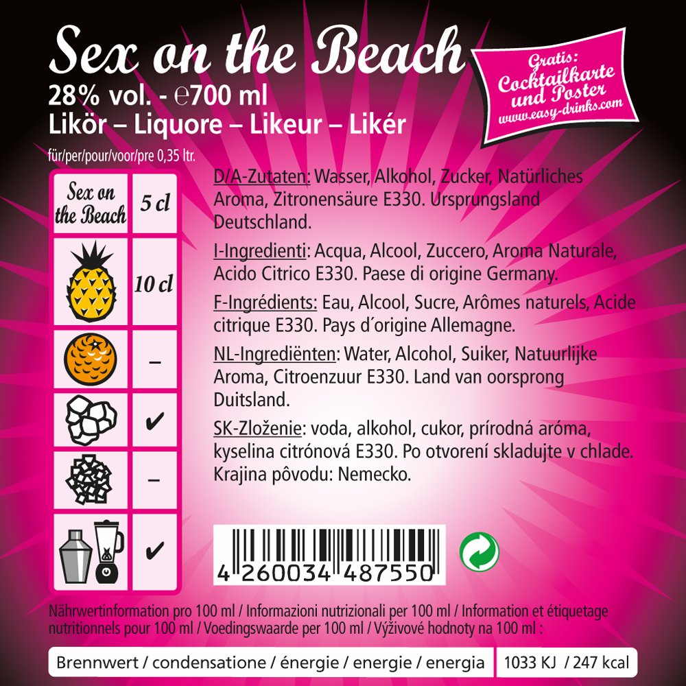 Der Premix Cocktail bzw. der Fertigcocktail Sex on the Beach beinhaltet 28% Vol. Alkohol. Diese sorgen auf natürliche Weise für die Haltbarkeit – auch nach dem Öffnen. easy drinks Fertigcocktail Sex on the Beach kann unbegrenzt verwendet werden, da er kein MHD hat.