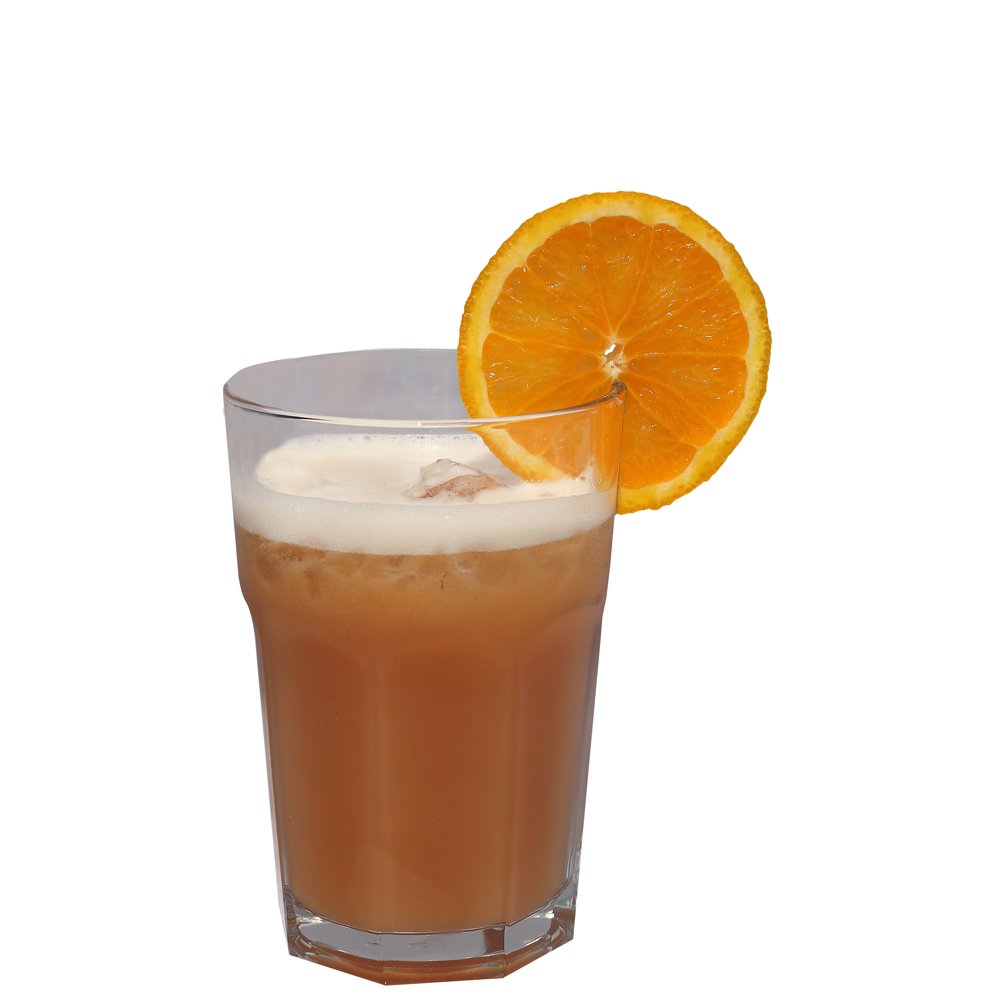 Zubereitung: Fertigcocktail Touch Down wird im Verhältnis 1:2 mit Orangensaft und Eis im Shaker gemixt.