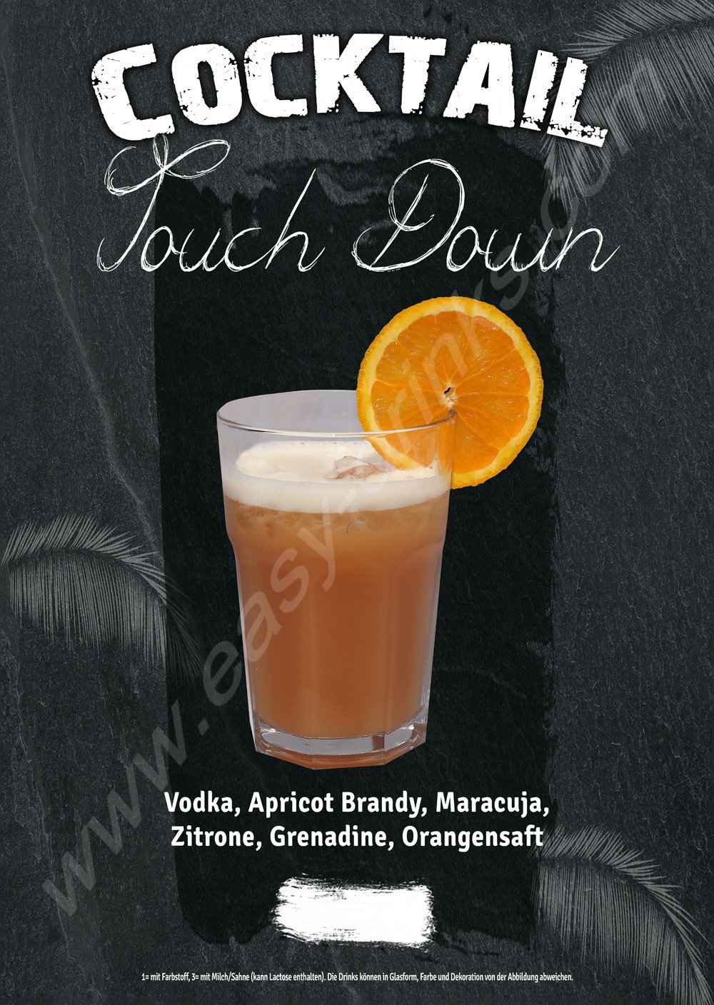 In einer Cocktailbar erhalten Sie bei einer Bestellung von “Touch Down” einen fruchtigen, süßen Drink mit folgenden Zutaten: Vodka, Apricot Brandy, Maracuja, Zitrone, Grenadine und Orangensaft
