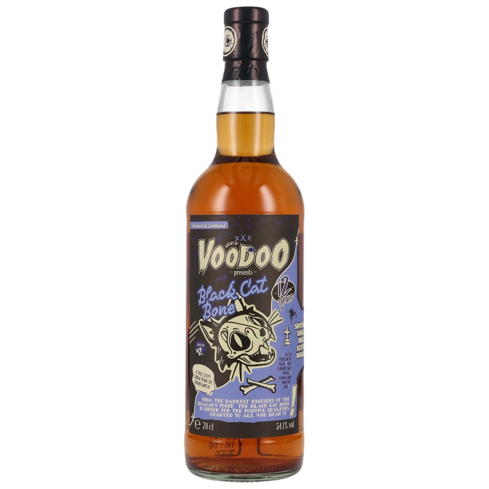 Brave New Spirits präsentiert die zweite der Batch der Whisky of Voodoo Serie. In dieser werden Whisky ohne Angabe des Namens der Destillerie veröffentlicht. Black Cat Bone ist ein 12 Jahre alter, nicht namentlich benannter Speyside Single Malt Whisky. Seine Farbe stammt vollständig aus der langen Fassreifung.